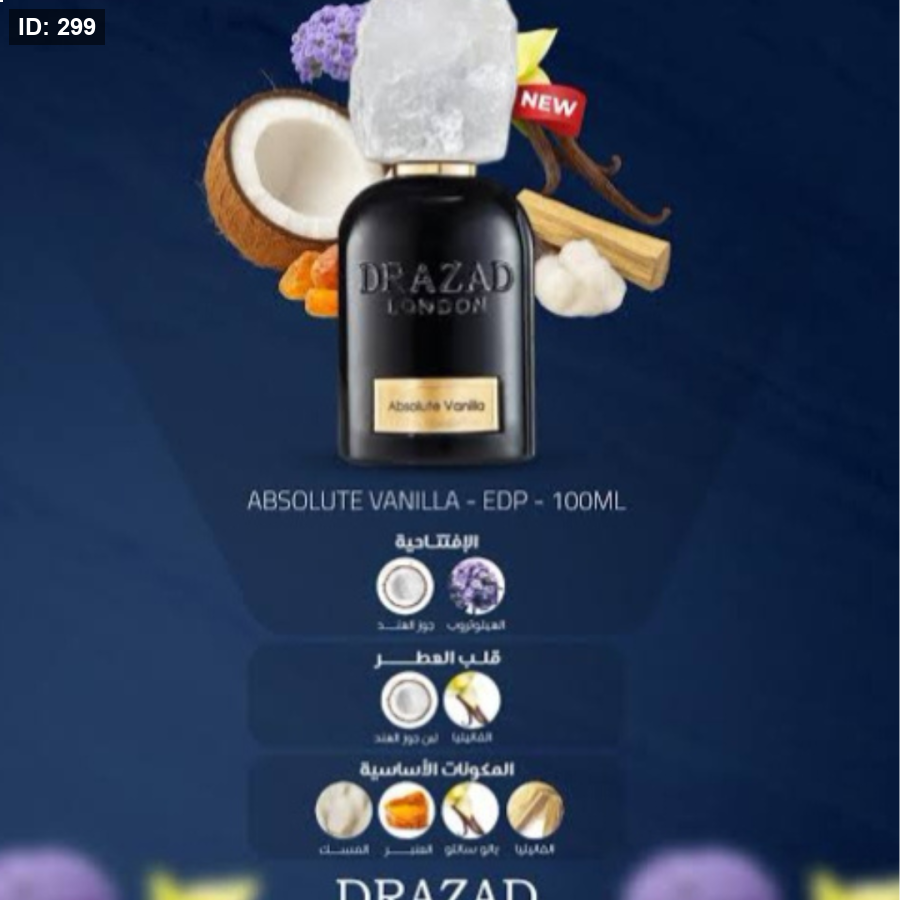 Absolute Vanilla Drazad London عطر للجنسين. هذا عطر جديد Absolute Vanilla صدر عام 2025. إفتتاحية العطر الهيلوتروب و جوز الهند; قلب العطر الفانيليا و لبن جوز الهند; قاعدة العطر تتكون من فانيليا بوربون, بالو سانتو, العنبر و المسك.