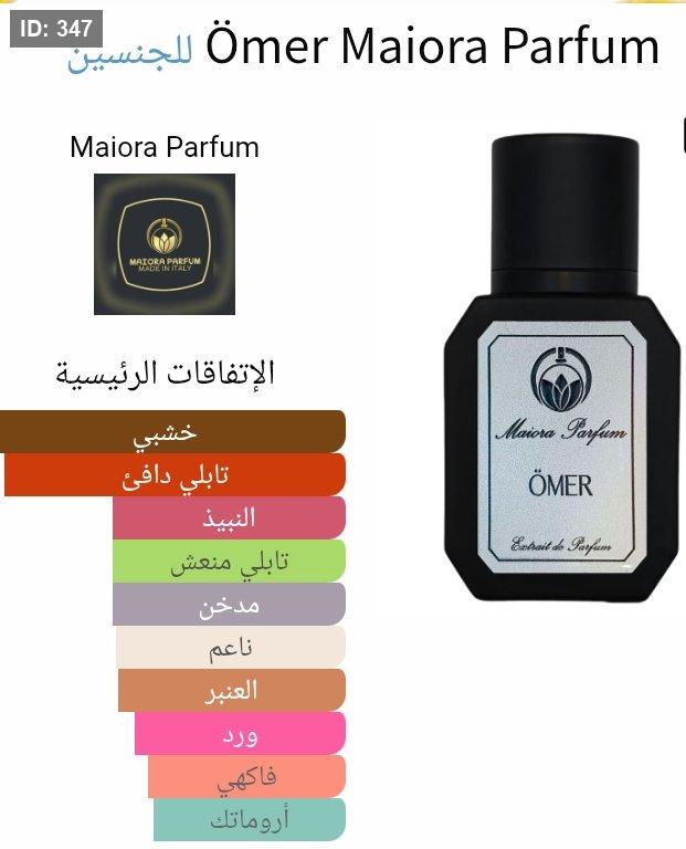 Ömer Maiora Parfum عطر شرقي - زهري للجنسين. Ömer صدر عام 2023. Antonio Gigli قام بتوقيع هذا العطر. إفتتاحية العطر الفلفل الأسود, النبيذ الأحمر, الخوخ, الأملاح المعدنية و تانجرين (اليوسفي); قلب العطر القرنفل, الورد التركي, السوسن, السيبرول (الناجراموثا) و الماغنوليا; قاعدة العطر تتكون من الدخان, خشب الأرز, حبوب التونكا, خشب الصندل, العنبر و نجيل الهند من هايتي.