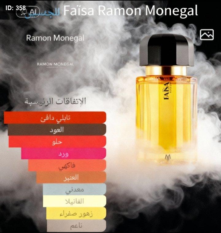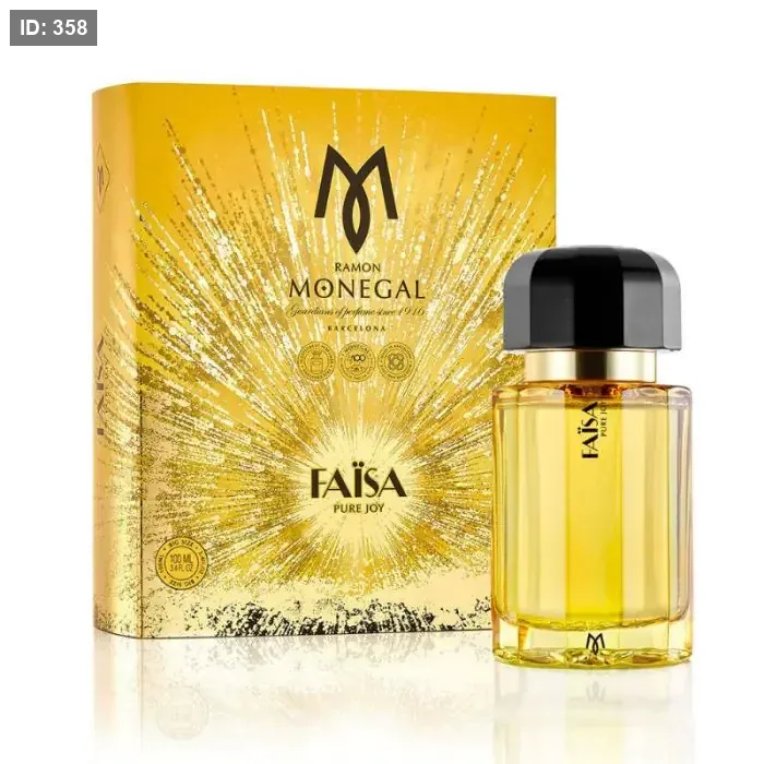 Faïsa Ramon Monegal عطر خشبي - حار للجنسين. Faïsa صدر عام 2020. Ramon Monegal قام بتوقيع هذا العطر. إفتتاحية العطر الزعفران, الإيلنغ, الليمون, الينسون و القرفة; قلب العطر العود, توت العليق, الورد, الميموزا و الياسمين; قاعدة العطر تتكون من العنبر, الفانيليا, خشب الصندل, الكاراميل و حبوب التونكا