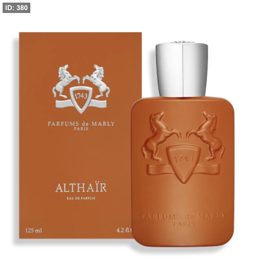 Althaïr Parfums de Marly عطر شرقي - فانيليا للرجال . Althaïr صدر عام 2023. Althaïr من توقيع Hamid Merati-Kashani و Ilias Ermenidis. إفتتاحية العطر القرفة, الهيل, زهر البرتقال و البرغموت; قلب العطر فانيليا بوربون و الإليمي; قاعدة العطر تتكون من حلوي اللوز, المسك, الأمبروكسان, أخشاب الغاياك, حبوب التونكا و اللوز المحلى.