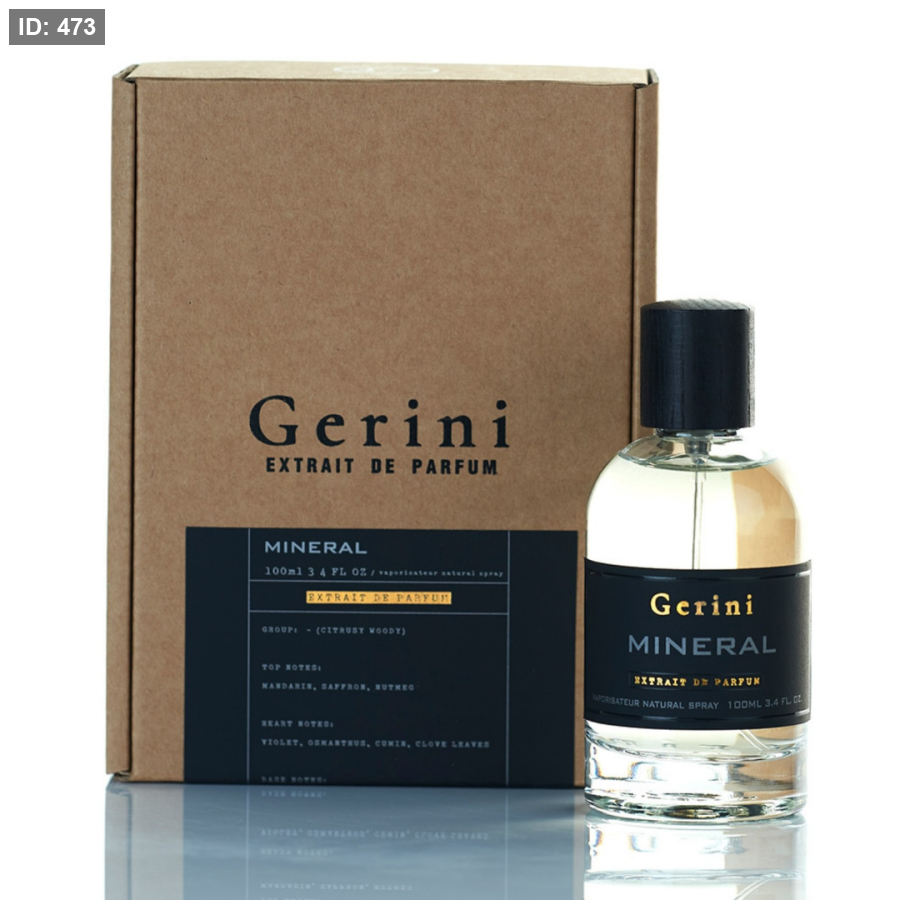Mineral Gerini عطر حمضيات - أروماتك للجنسين. Mineral صدر عام 2022. إفتتاحية العطر الزعفران, الماندرين (اليوسفي) و جوزه الطيب; قلب العطر أوسمانثوس , القرنفل, الكمون و البنفسج; قاعدة العطر تتكون من المسك, الطحالب, العود, العنبر و الباتشولي